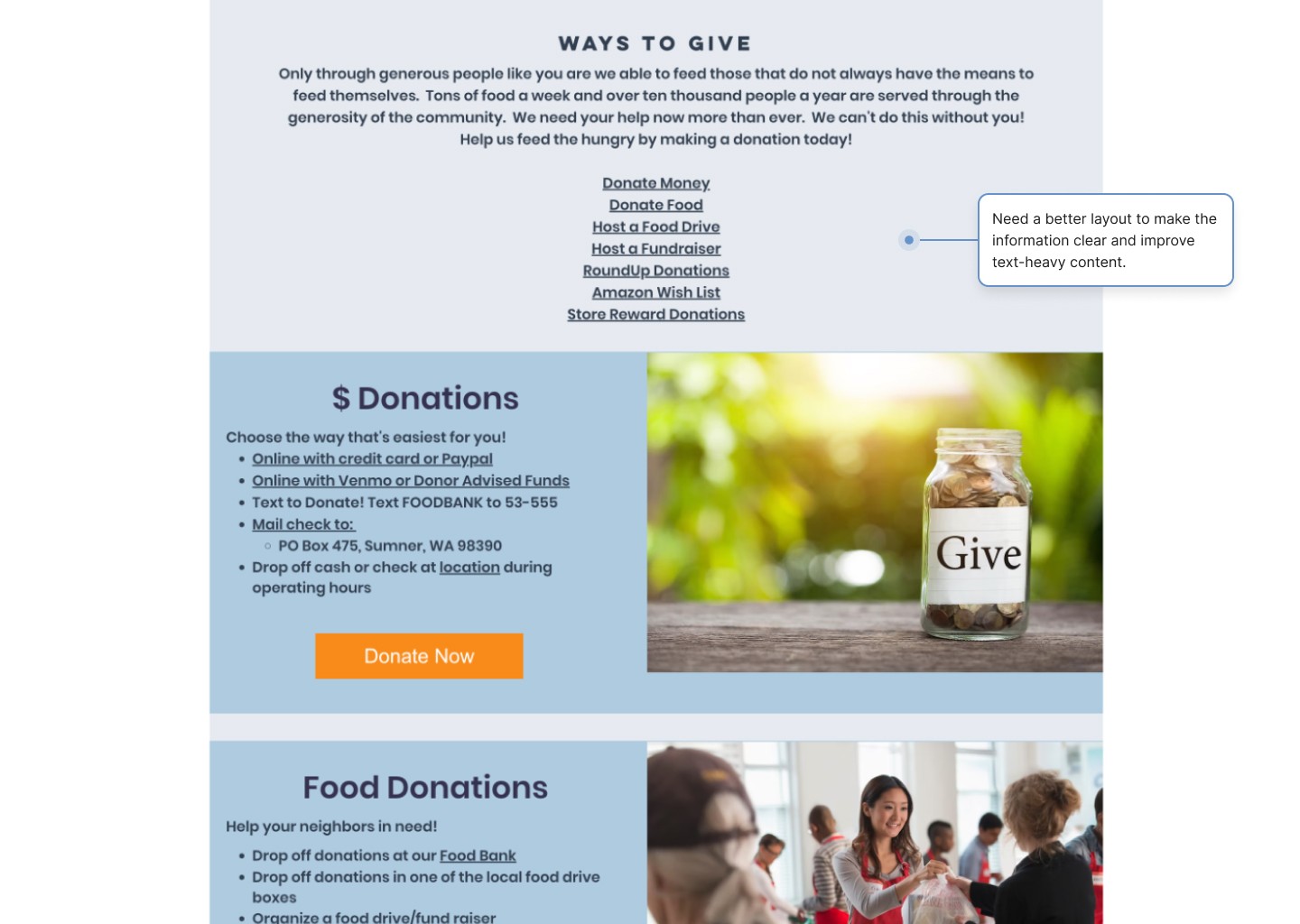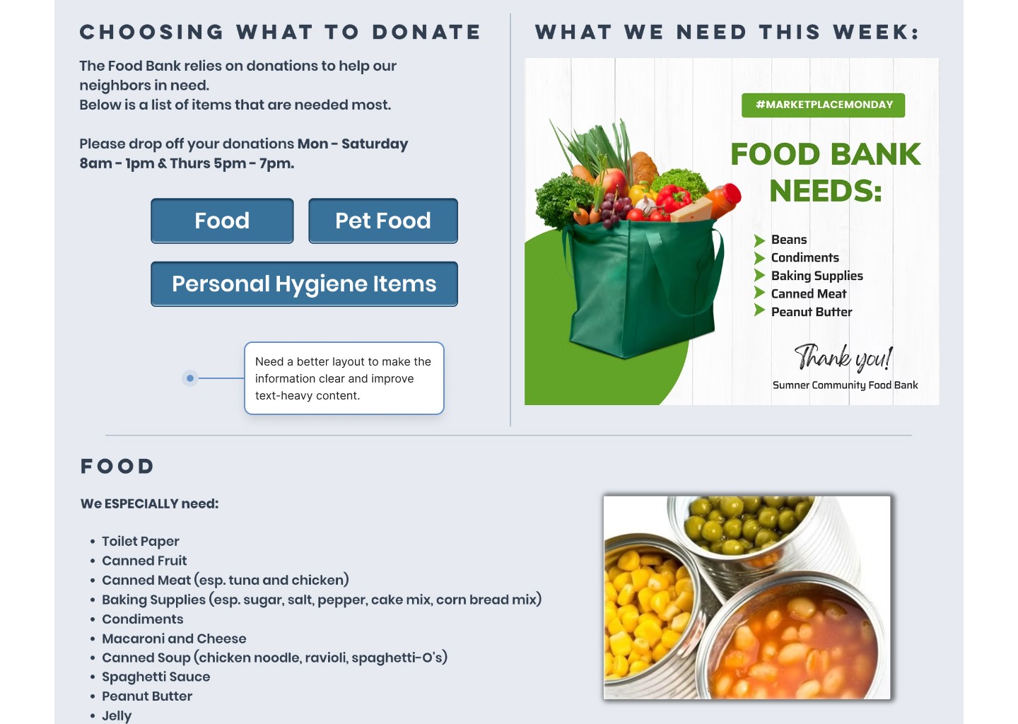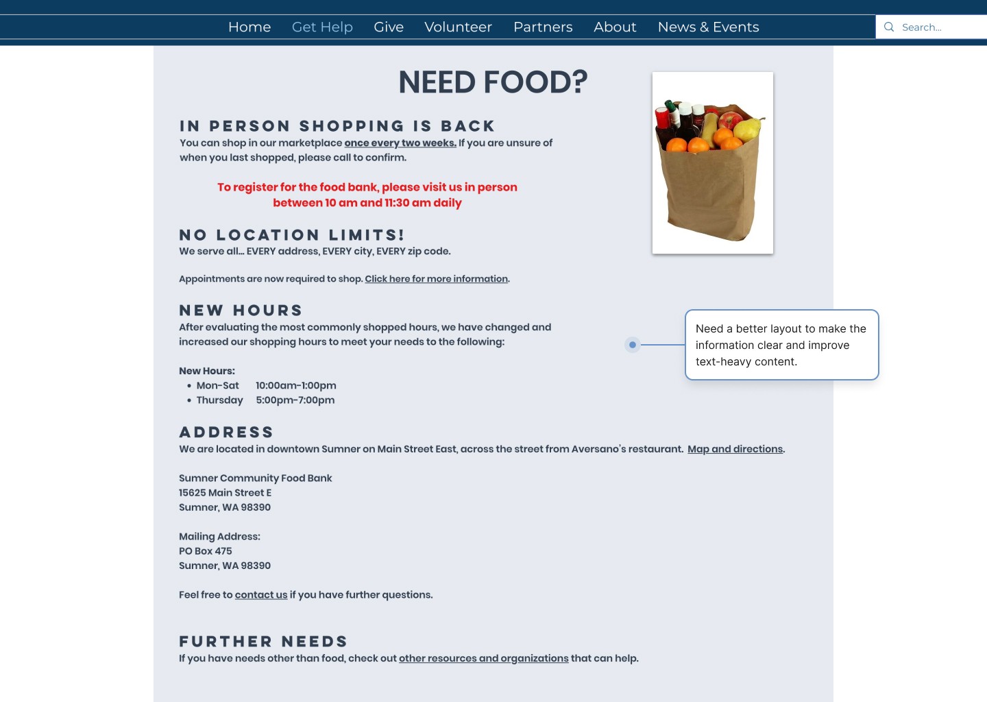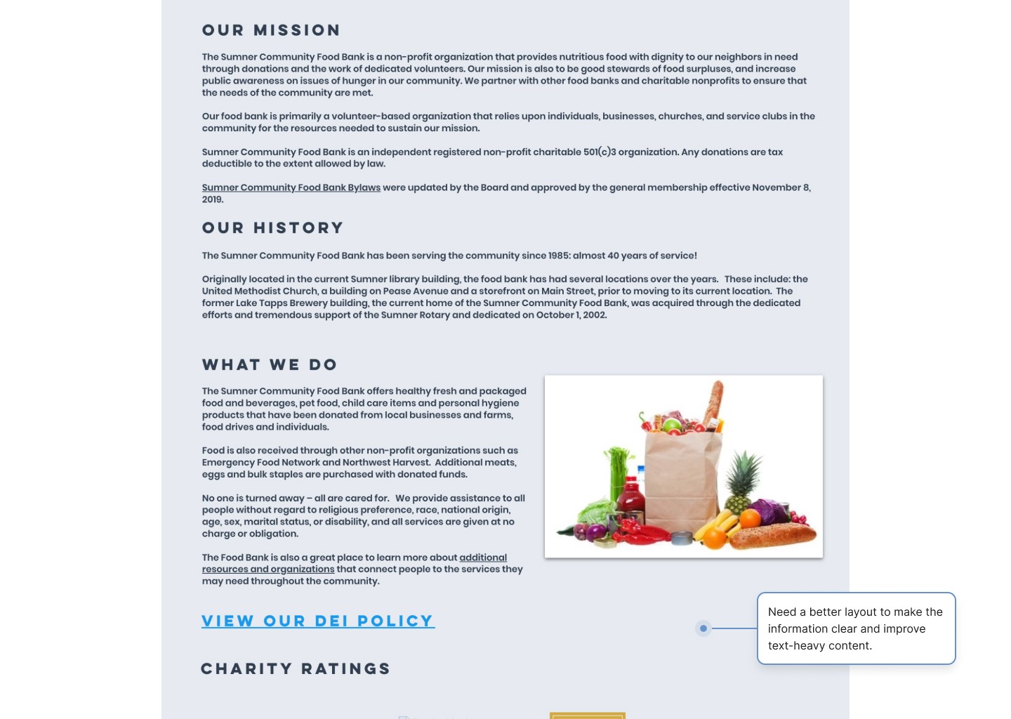 Meanwhile, the Sumner Food Bank’s website lacks a clear hierarchy, making it difficult for users to navigate and locate the information they need.