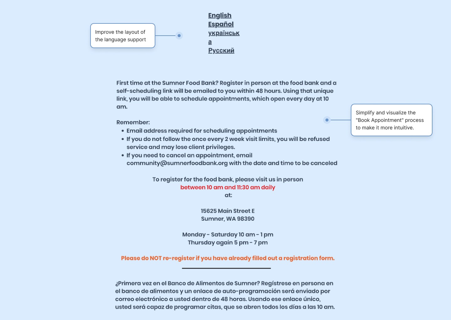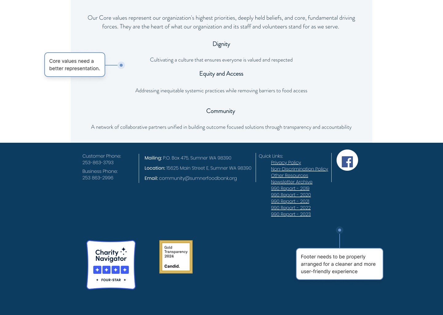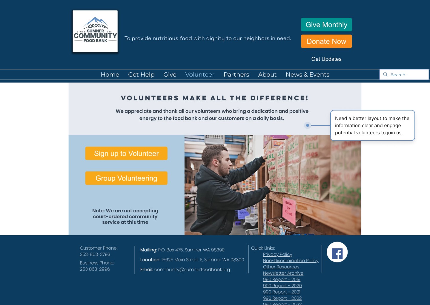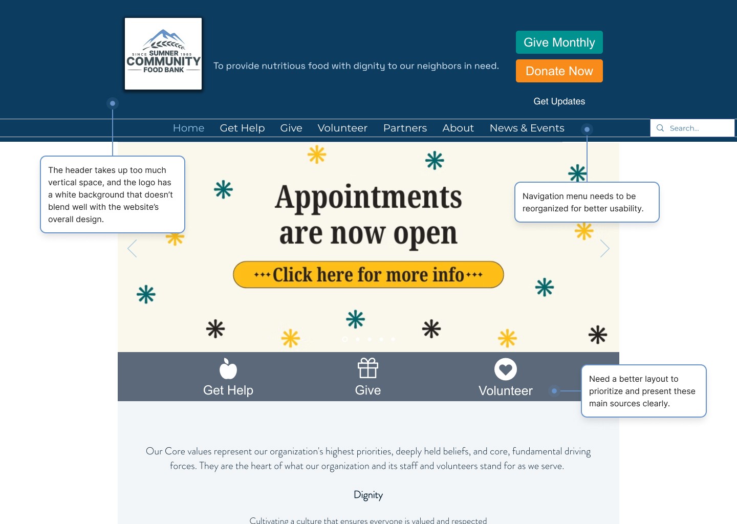 Meanwhile, the Sumner Food Bank’s website lacks a clear hierarchy, making it difficult for users to navigate and locate the information they need.