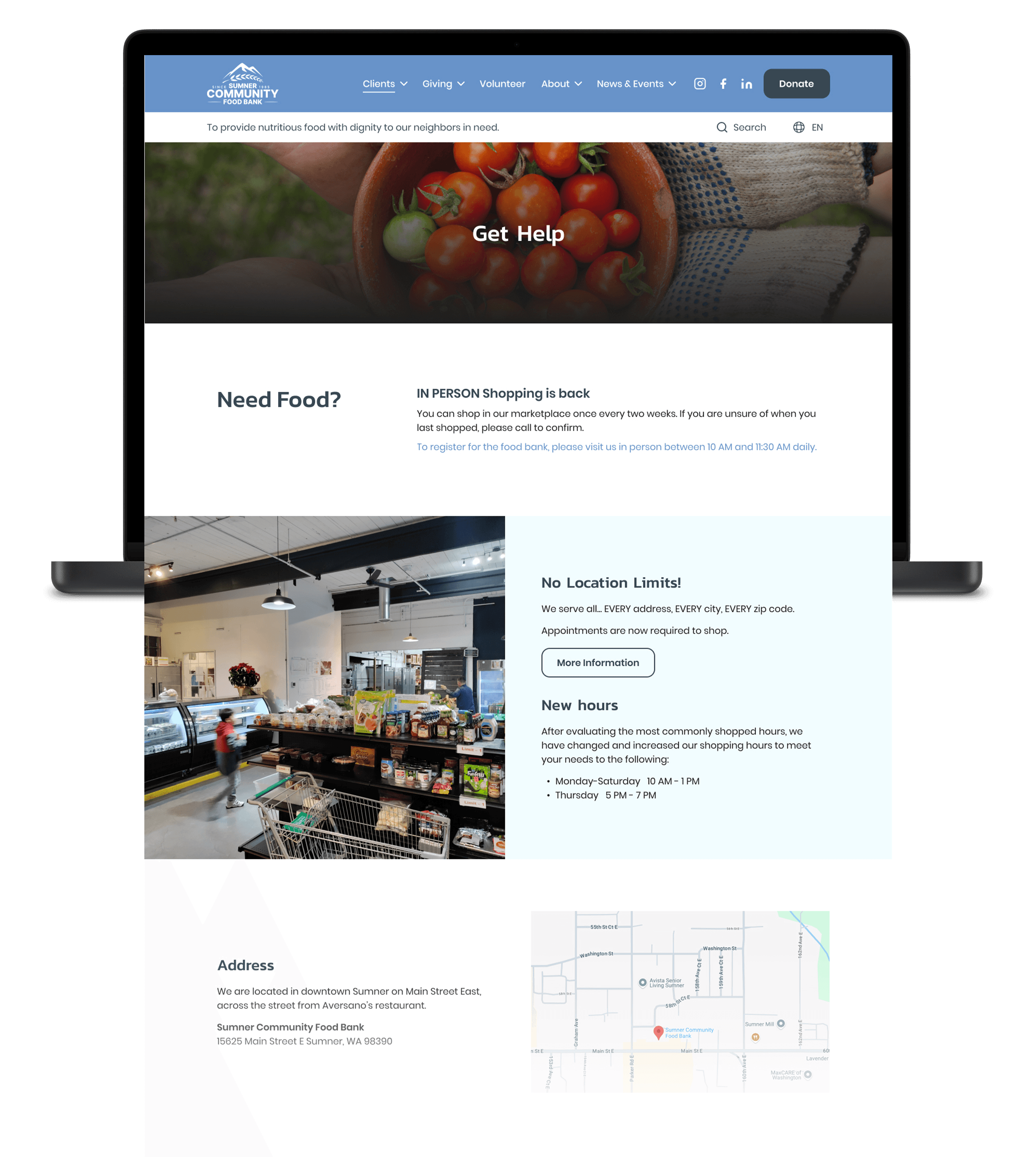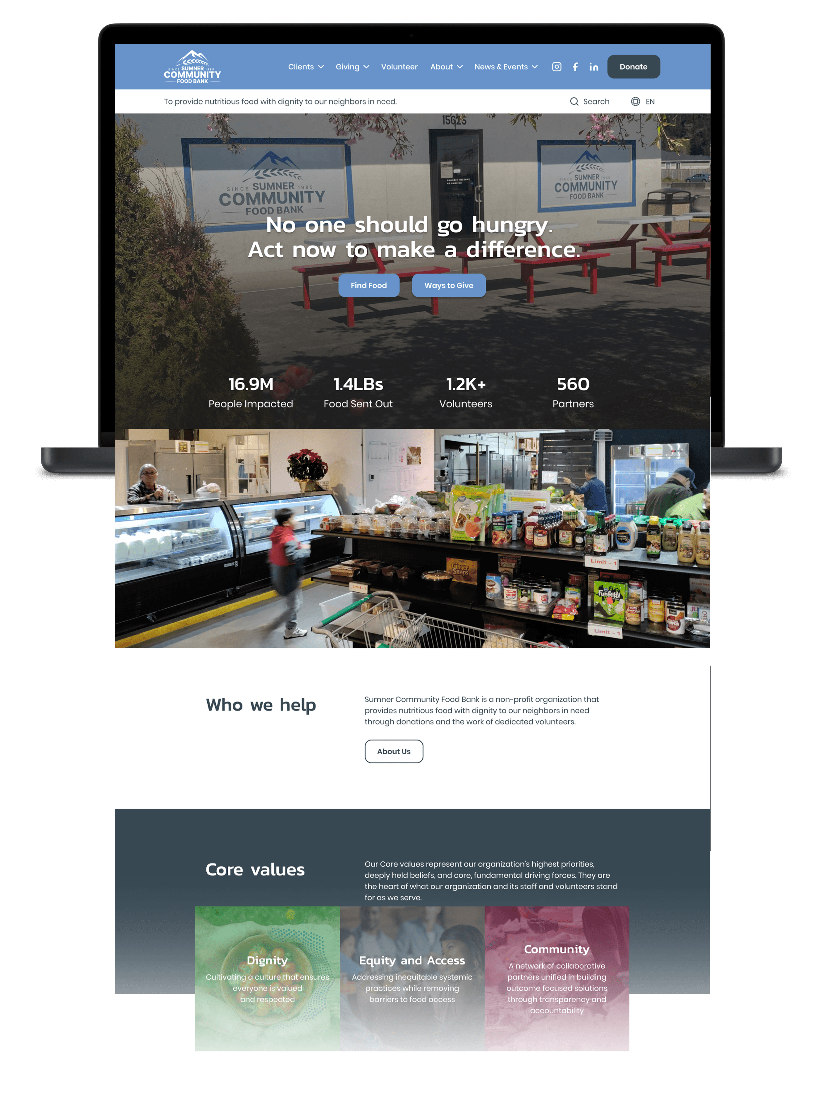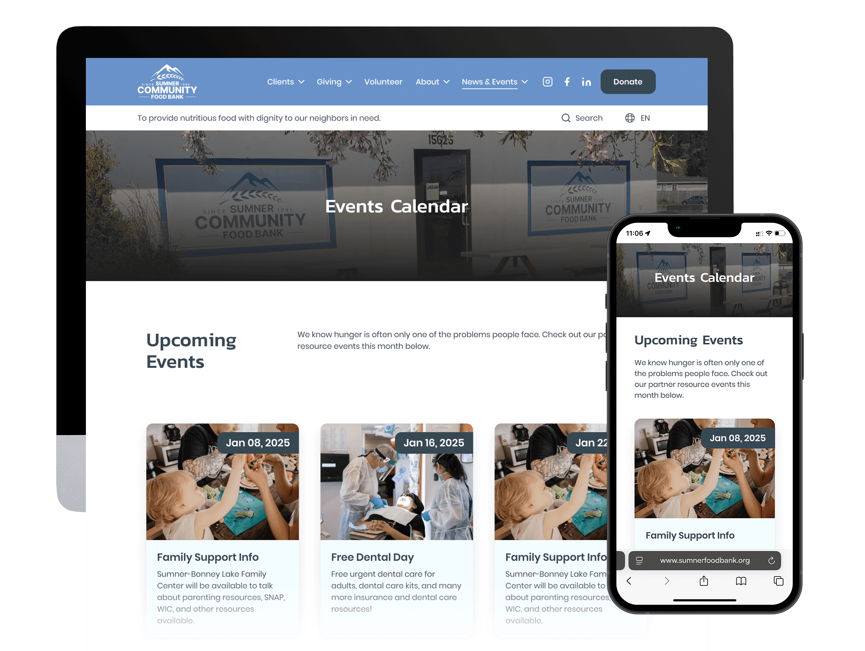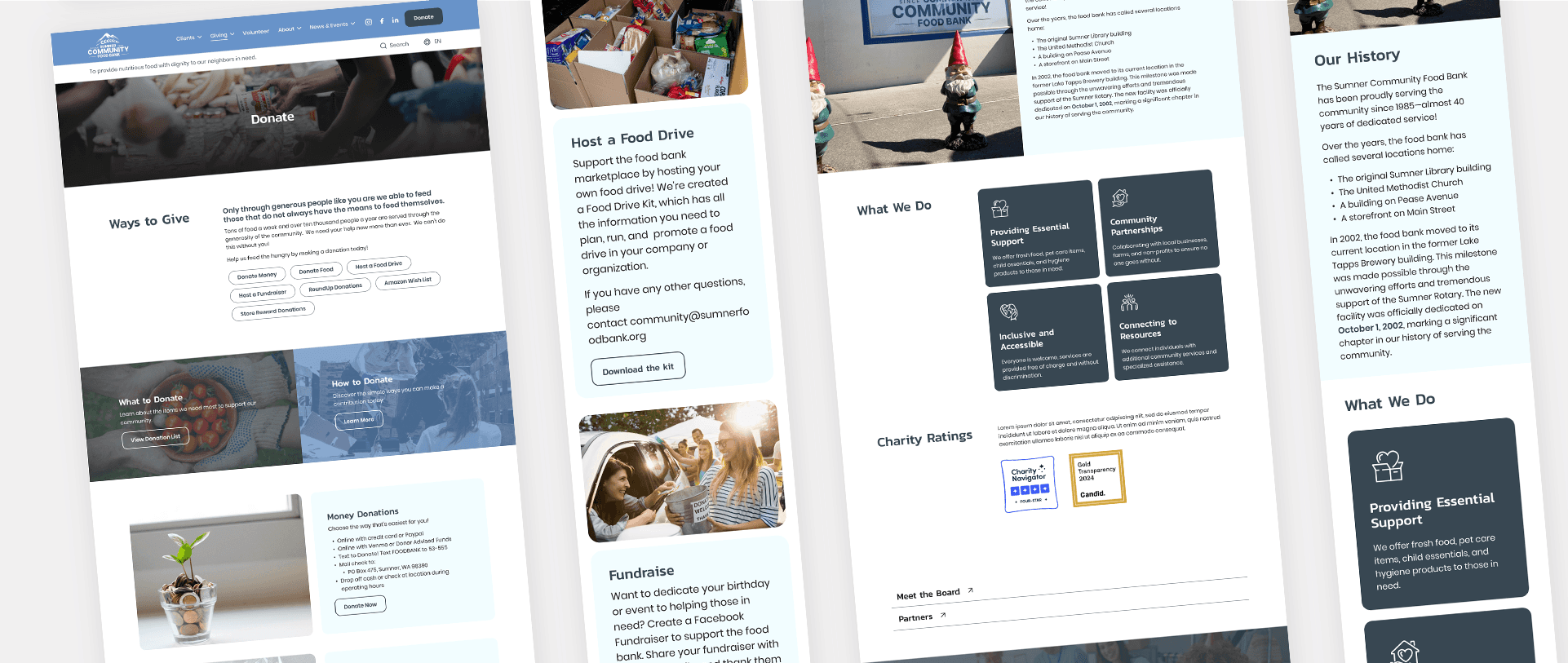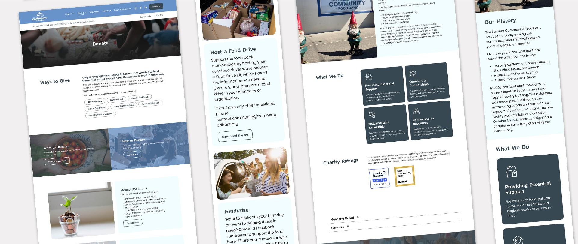 Both websites use a large hero image on their homepage, while the Sumner Food Bank uses an image carousel to present its information.