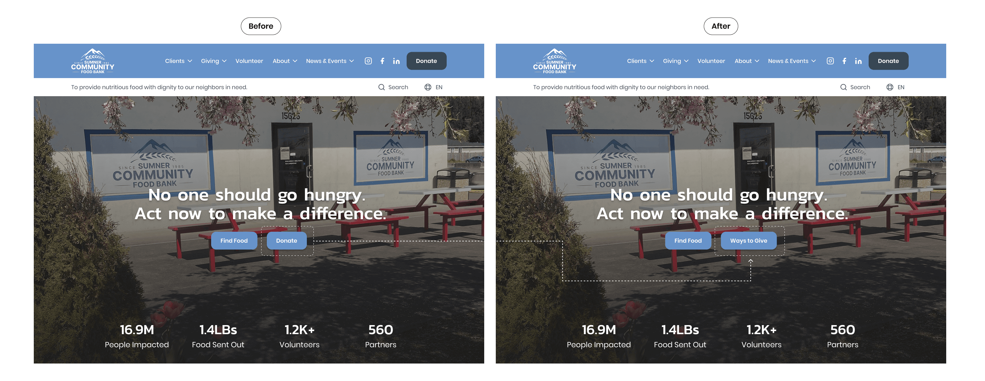Both websites have a clear visual hierarchy that shows the action that the organization wants the user to take on their site. For example, make a donation, to volunteer, or seeking food assistance.